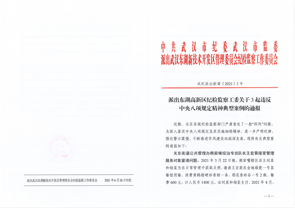 派出東湖高新區紀檢監察工委關于3起違反中央八項規定精神典型案例的通報
