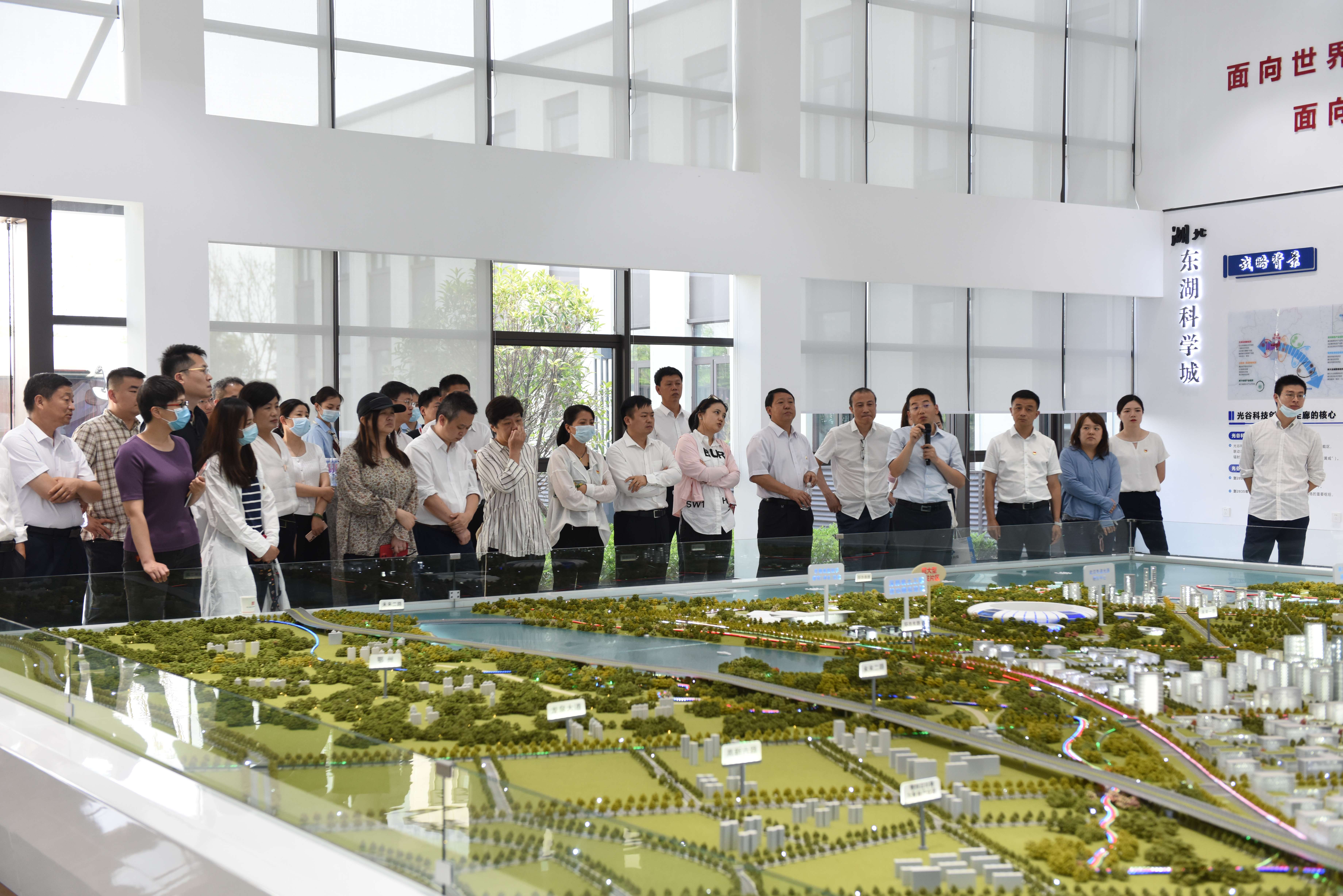 參觀現場,產業園公司總經理王樂介紹了創新園二期及海洋院項目基本情況與施工進度,創新園二期項目商業配套、多層研發、展示中心及獨棟多層廠房已封頂;海洋院項目已進入裝修部分收尾階段,預計8月項目全部完工交付使用。光谷置業公司總經理祁佺向大家介紹了之寓未來項目的開工進展情況,并展示了之寓未來項目樣板間,該項目建設除去疫情僅13個月達到精裝入住標準,一期首開2-8棟947套1577間,于7月15日入住,剩余8棟2194套將于明年三月交付入住,二期今年7月底開工,2024年整體交付;數字經濟產業園項目地下室施工已完成,正在進行地上主體結構施工,預計2025年12月竣工。隨后汪志忠一行帶領大家前往科學島展廳及項目指揮部,科投集團副總經理劉坤對科學島項目整體規劃及建設進度做了詳細介紹,科學島公司董事長金波對科學島前期工作和展廳的建設做了全面介紹,按照管委會對科學島項目“4.30”任務節點相關工作要求,積極響應,在保障安全的前提下高效的完成了各項任務。